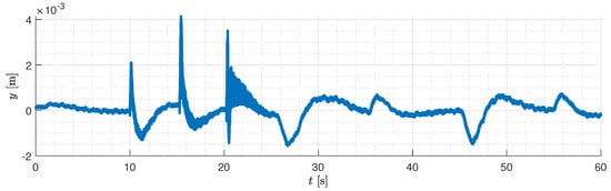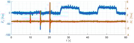 The robustness of the controller with the gains developed in Section 5.2.3 is examined in this section. To evaluate this, the reference lateral displacement is set to a constant zero, and disturbances are applied to the system. Specifically, at 10 , 15 , and 20 , rapid perturbations with increasing amplitudes simulate the effects of rail irregularities. At 25 and 45 , an approximately constant force is applied to the test rig for 10 , mimicking the effect of side wind. The measured force and torque of the right force–torque sensor are shown in Figure 17, while the measured lateral displacement is depicted in Figure 18.