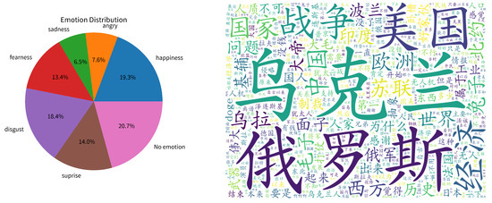 In the experiment of this article, the dataset used is collected from the Chinese bullet-screen video website “bilibili”, with the theme of “the Russia–Ukraine War”. Using a crawler in the xml file format, bullet-screen information between 24 February 2022 and 11 April 2024 is collected. Further data processing is carried out on these bullet screens, removing the expressions, meaningless symbols and repeated meaningless words in the bullet screens. The original dataset sorted out contains a total of 14,560 bullet-screen messages in all, and these datasets are manually labeled with emotional label. In this experiment, the classification labels of emotional vocabulary from Dalian University of Technology were referenced, and the emotions of the bullet screens are divided into seven categories: “fearness”, “sadness”, “angry”, “happiness”, “disgust”, “suprise”, and “no emotion”. The proportion of various emotions in the dataset is shown in Figure 1, and it can be seen that the emotional distribution is not uniform enough. The proportions of “sadness” and “angry” are relatively small. Unbalanced data will reduce the classification performance of the model and may lead to overfitting during model training. Therefore, the data augmentation method is adopted to replace the synonyms of the existing “sadness” and “angry” samples in the original dataset to balance the proportion of sample classification. The enhanced data are sorted into the “enhanced dataset”. We have made a word cloud of the words that appear more frequently in the dataset, through which the high-frequency words in the database can be seen in a more intuitive form. The word cloud and the enhanced dataset are shown in Table 1.