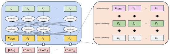 BERT is a deep language model constructed based on the Transformer architecture proposed by Google in 2018. Its model architecture is shown in Figure 2, which is mainly composed of the stacking of the encoders of the Transformer. The transformers between each layer are bidirectional. By using the multi-head attention mechanism, the model can focus on different positions of the input tokens and allocate different weights according to the importance. The input of BERT consists of three layers of embeddings: Token Embedding, Segment Embedding, and Position Embedding. These three layers of embeddings are, respectively, used to represent semantics, distinguish different sentences, and represent the sequence information of tokens. Through the combination of these three layers of Embedding, BERT can understand the semantic connotation of the text more comprehensively and accurately. The main training tasks of BERT are mainly two: Masked Language Model (MLM) and Next Sentence Prediction (NSP). The MLM method uses the WordPiece-based tokenization method to split a complete word into several sub-words. When generating training samples, these separated sub-words will be randomly masked, and then the model needs to predict the masked sub-words according to the context. This way can prompt the model to learn the internal structure and semantic relationship of words and enhance the understanding ability of the language. However, in the bert-Chinese released by Google, the tokenization method does not take into account the integrity of Chinese words and still masks the granularity of characters, which may split a complete Chinese word into meaningless two characters. The Harbin Institute of Technology, in view of the characteristics of Chinese, proposed a whole-word mask (wwm) training method [22]. This method uses the model architecture of BERT, but improves the tokenization method, which uses the Harbin Institute of Technology Language Technology Platform (LTP) as the tokenization tool to mask all the Chinese characters of the same word. Not only that, in addition to the original Chinese Wikipedia in the training corpus, other data such as encyclopedias, news, and Q&A are added. This enhances the ability of the model in Chinese classification tasks. Based on the above advantages, in the experiment of this paper, RoBERTa-wwm-ext-large is selected as a part of the feature extraction model.