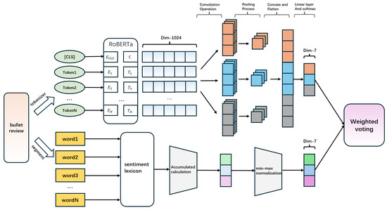 Summarizing the above methods, we have proposed a method that combines the sentiment lexicon, the multi-scale feature extraction and RoBERTa-wwm to capture the bullet screen emotion information of the “Russia–Ukraine War” theme. The overall structure of the model is shown in Figure 3.