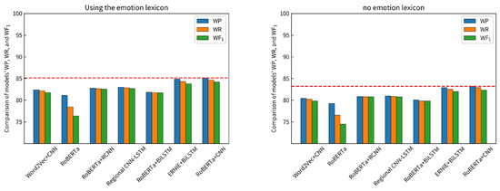 The experimental results of the model proposed in this article are shown in Table 3. It can be seen from Table 3 that the RoBERTa-CNN model fused with the sentiment lexicon proposed by us has achieved good results in multiple evaluation indicators of the bullet screen emotion classification task. Compared to the single RoBERTa-wwm, the model in this article has improved by 4% in weighted precision, indicating the effectiveness of the multi-scale convolutional local feature extraction of CNN. We can intuitively see the comparison of the model effects from Figure 4, the RoBERTa+CNN model using the sentiment lexicon has a 1.91% higher weighted precision than without using the sentiment lexicon, indicating that the sentiment lexicon module can better capture the emotional characteristics of vocabulary in specific fields. We also compared the commonly used emotion classification models such as RoBERTa+RCNN, Regional CNN+LSTM, ERNIE+BiLSTM and RoBERTa+BiLSTM. Compared to RoBERTa+RCNN, Regional CNN+LSTM, ERNIE+BiLSTM and RoBERTa+BiLSTM, the model proposed in this article has 2.35%, 2.1%, 0.24% and 3.27% higher in weighted precision, respectively. Compared to the Word2Vec+CNN model, the model in this article has improved by 2.75% in weighted precision, indicating that using the RoBERTa-wwm pre-trained model can better capture the context information of words and improve the performance of emotion classification.