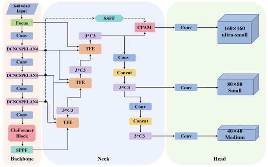 The newly added feature pyramid layer includes the TFE feature fusion operation. To integrate the three-scale feature maps onto the 160 × 160 pixel detection layer, the feature maps downscaled for the first and second time in the backbone network are concatenated with the previous layer of the feature pyramid. The output of the small object detection layer, after the fusion of three-scale features, shows superior performance in detecting small objects. However, this additional detection head increases network parameters and computational complexity. Given that large objects are rare in aerial shots, the original large object detection head and related structures in the neck network are removed to improve computational speed.