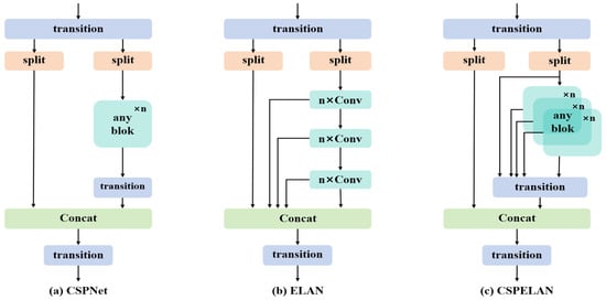 The DCNCSPELAN4 module mimics the design of CSPNet [11], as shown in Figure 3a, allowing the convolution operation in the ELAN [10] structure to be replaced with any computable module. The ELAN structure, depicted in Figure 3b, is a classic module in deep learning primarily used for label propagation tasks. The structure of the CSPELAN module [38], shown in Figure 3c, introduces cross-stage partial connections based on ELAN, enabling the network to better utilize feature information from previous stages, thereby enhancing the network’s efficiency and performance.
