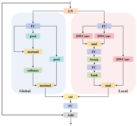 In the local enhancement operation, the first step involves combining Q and K to generate context-aware weights. This process requires the use of two DWconvs to, respectively, aggregate local information from Q and K. Next, the Hadamard product of Q and K is computed, and the result undergoes a series of transformations to obtain context-aware weights between −1 and 1. The output of the local branch can be expressed as follows: