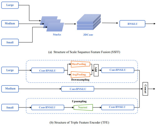 To address the challenge of multi-scale feature extraction, YOLOv5 employs a feature pyramid structure to merge pyramid features using addition or concatenation methods. However, this approach may not fully exploit the relationships between feature maps of different scales. As depicted in Figure 6a, the scale sequence feature fusion (SSFF) method enhances this capability by effectively integrating the high-dimensional information from deep feature maps with the fine-grained details from shallow feature maps. While a blurry image may lose some details, its structural features remain preserved [41]. Thus, the scaled images used as input for SSFF can be derived through the following operation: