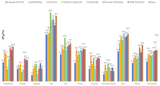 Finally, the algorithm proposed in this article was validated on the Visdrone2019-test. The experiment selected some representative single-stage algorithms and two-stage algorithms for comparative experiments, including Cascade-RCNN [17], mSODANet [50], UCGNet [51], YOLOv3_ReSAM [26], YOLOv8s, PVswin-YOLOv8s [35], and TPH-YOLOv5 [32], including some SOTA models. The experiment analyzed the 10 object categories in the Visdrone dataset separately, with the evaluation metric being AP50. The experimental results are shown in Figure 7. Thanks to the global receptive field and multi-scale feature fusion, the improved YOLOv5s algorithm excels in detecting small target categories such as pedestrians and motorcycles, achieving AP50 scores of 40.6% and 42.6%, respectively—the highest among all the algorithms presented. Additionally, for the categories prone to misdetection, such as vans and trucks, the improved YOLOv5s algorithm achieved AP50 scores of 44.1% and 37.6%, outperforming other object detection algorithms. Overall, our proposed algorithm achieved the highest AP50 on the test set, reaching 36.5%. In comparison to the SOTA TPH-YOLOv5, which has an AP50 of 36.1%, our model is much lighter and more accurate.