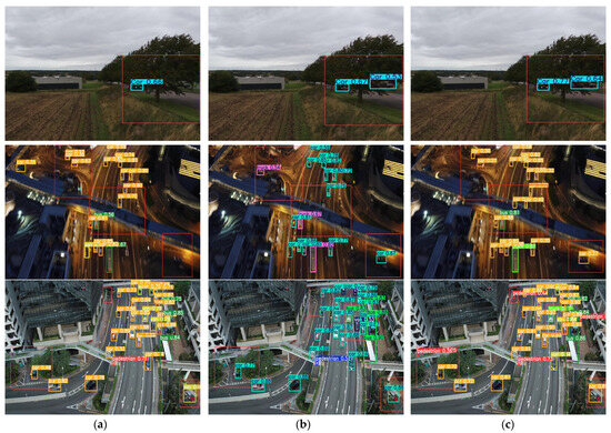 Performance of the original YOLOv5, TPH-YOLOv5, and the proposed algorithm on the AU-AIR and Visdrone2019-test. (a) Original YOLOv5; (b) TPH-YOLOv5; (c) the proposed algorithm.