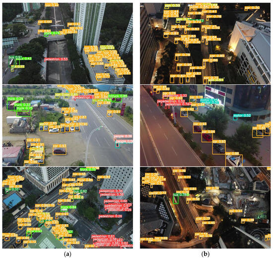 All experiments in this study were conducted using the VisDrone2019 dataset [42] and the AU-AIR dataset [43] for training and testing. The VisDrone2019 dataset, compiled by the AISKYEYE team at Tianjin University’s Machine Learning and Data Mining Laboratory, comprises 288 video clips, 261,908 frames, and 10,209 static images. Of these static images, 6471 are used for training, 548 for validation, and 3190 for testing. The images were captured by various drones in diverse scenes, including urban and rural environments, and feature a wide range of objects (vehicles, pedestrians, etc.), lighting conditions (daytime and nighttime), and densities (sparse, dense, and occluded). Over 2.6 million objects have been manually annotated into 10 different categories, addressing all challenges in drone-based object detection tasks. The AU-AIR dataset is the first multimodal dataset specifically designed for detecting small-scale objects in drone imagery. It contains two hours of raw video captured from an aerial device, featuring 32,823 annotated frames and 8 object categories for traffic monitoring purposes. The object instances include cars, vans, trucks, humans, trailers, bicycles, buses, and motorbikes.