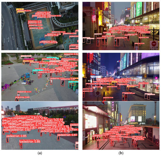 The detection effect of our improved YOLOv5s in the urban traffic supervision scenario. (a) Daytime urban traffic scenario; (b) nighttime urban traffic scenario.