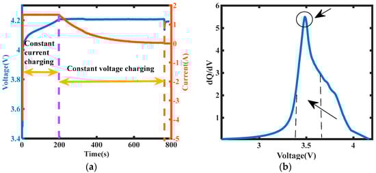 Charging process curve: (a) charging voltage and current curves; (b) charge IC curve.