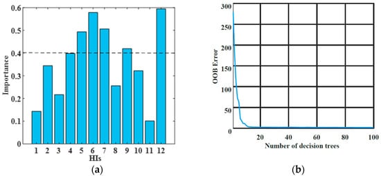 The random forest [] algorithm is a multi-decision tree classifier based on classification and regression trees. Each decision tree follows bootstrap sampling (a type of sampling with replay) and then calculates the error based on the OOB error estimate of the sample. Instead of considering all the variables of each node to determine the optimal segmentation threshold, RF uses a random subset of the initial feature set to generate a large number of uncorrelated decision trees. The advantages of RF are that it does not require variables to follow a specific statistical distribution, the training sample is small, it is less sensitive to overfitting, and it is able to analyze the contribution of features to reducing impurity when building decision trees to assess their importance and rank the importance of features, which is suitable for lithium-ion battery function selection. Thus, by random forest analysis, the statistics shown in the graph are obtained, and Figure 2a shows that only five of the twelve characteristics of HIS are more important than the threshold of 0.4. This result suggests that these five features play a more critical role in the model and contribute more to the predictive power of the model, so they can be considered more sensitive, and the use of these data will make the experimental results more accurate. Therefore, by setting the number of decision trees to 100 and the number of leaves to five, it is possible to build a model that captures key features while maintaining good generalization capabilities.