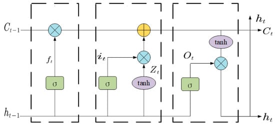 The LSTM cleverly preserves long- and short-term memory through a memory cell and gating mechanism. The basic architecture of the LSTM unit is shown in Figure 4. The LSTM unit consists of an oblivion gate, an input gate, and an output gate. The input gate controls the degree to which new information is received, while the output gate determines the information that is output and the forgetting gate controls the degree to which historical information is forgotten. The LSTM unit consists of an amnesia gate, an input gate, and an output gate.