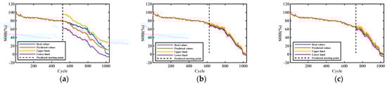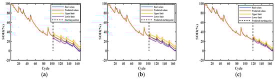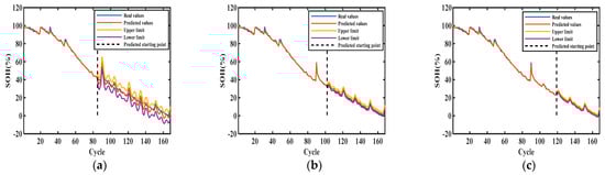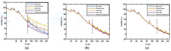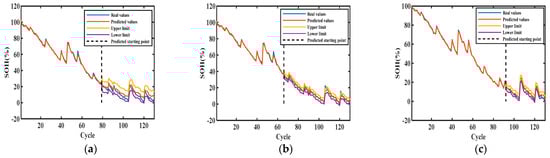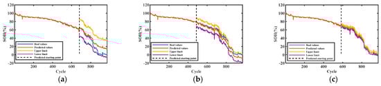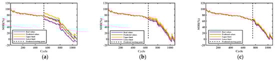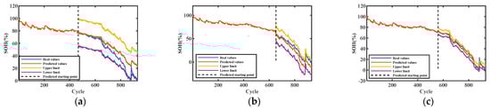 Figure 6, Figure 7, Figure 8 and Figure 9 show the interval prediction results for each cell. Table 3 shows the predicted SOH metric results for the validation unit. The predicted SOH trajectories for #5 in (c) and (b) accurately track the reference SOH trajectories as the training data increases, as shown in Figure 6. The predicted SOH decay paths in (a) at 50% of the training count deviate from the reference path at the tail, but they also have the same downward trend. As shown in the evaluation index results of #5 in Table 3, the maximum ICP does not exceed 0.2858 and the minimum IAW is not less than 0.92, indicating that the proposed SOH prediction model can accurately predict the SOH of batteries under this training mode.