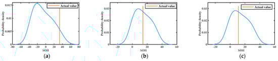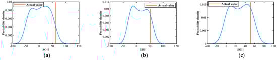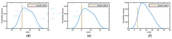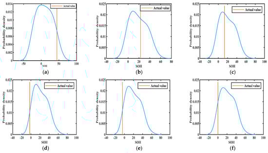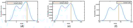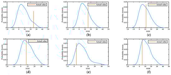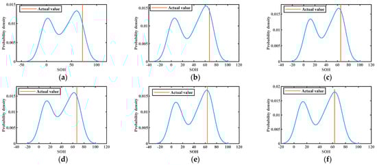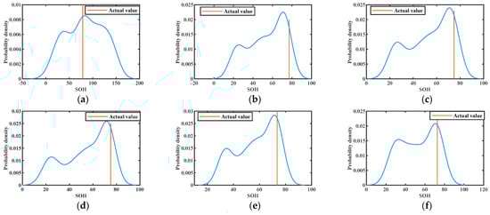 The results of KDE at different training numbers are shown in Figure 10, Figure 11 and Figure 12. The probability density functions of the 1st, 30th, 50th, 70th, 76th, and 84th prediction points at 50% training numbers are given in Figure 10. The line perpendicular to the horizontal line in the figure is the actual value at the moment of prediction. The maximum value of the vertical axis of the probability density function is the most likely value obtained for the deterministic prediction. It can be seen that the actual value appears near the highest probability point on the probability density curve, and the actual value becomes closer to the highest point of the curve as the number of training increases. This indicates that the uncertainty fluctuations of SOH can be described by the probability curve. In conclusion, the proposed model can effectively provide more information about the SOH of lithium batteries.