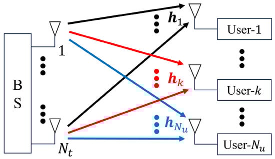 where , is the additive white Gaussian noise (AWGN) vector, and each element follows . Therefore, the received signal at the k-th user is expressed as