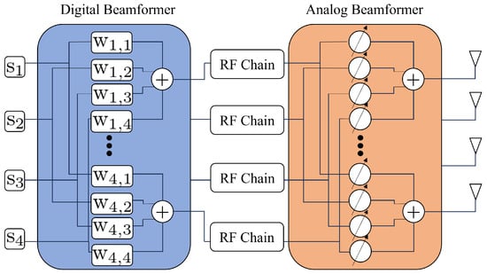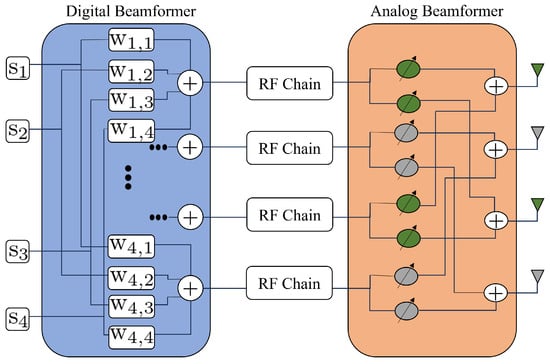 There are two types of beamforming: analog beamforming, which adjusts phase, and digital beamforming, which adjusts amplitude and phase []. Analog beamforming (ABF) makes it difficult to form multiple beams simultaneously because a single radio frequency (RF) signal is connected to all antennas via phase shifters to control the direction of the beams. This will be a limiting issue in next-generation communications, where diverse users and devices will access the system simultaneously. Also, ABF is limited by the resolution of the phase shifter used in practice, which reduces the accuracy of angular adjustment and makes it difficult to perform optimal beamforming [], whereas digital beamforming (DBF) is mainly used because digital signal processing can control different phases and amplitudes for each antenna, allowing for better adjustment of the beam direction. However, DBF requires one RF chain per antenna, which consists of a filter, a digital-to-analog converter (DAC), an analog-to-digital converter (ADC), and an amplifier, making it expensive and making it consume more power []. DBF becomes impractical as the number of antennas increases. Hybrid beamforming (HBF), which combines ABF and DBF, is attracting attention as a practical solution because it reduces the number of RF chains compared to DBF, thus lowering cost and power consumption [].