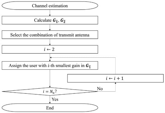 where with . is the number of all combinations that divide the transmitting antenna into . (15) denotes the gain at the combination of the m-th and n-th transmit antennas and the gain of the l-th combination. Next, we select the combination that maximizes the gain of the user with the smallest gain . The other group is the combination of the antennas that has not been selected. Finally, we determine the group of antennas with the larger gain in of the two groups of antenna combinations, starting from the user with the second-smallest gain , in decreasing order. In this case, the number of users in each group should be .