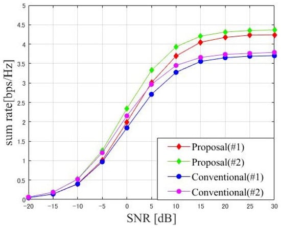 Figure 5 shows the sum-rate characteristics of the proposed method and the conventional method when the number of transmit antennas is 4 and the number of users is 4. Comparing the conventional and the proposed method, there is almost no difference at low SNR because the noise power is dominant, but at high SNR, the sum-rate of the proposed method becomes larger than that of the conventional method. In particular, the sum-rate of the proposed method improves by about 14.5% for case 1 and by about 15.2% for case 2 when the SNR is 30 dB compared to the conventional method. Comparing case 1 and case 2, the sum-rate of case 2 is larger for both conventional and proposed methods. Thus, antenna selection is also considered effective in the proposed method.