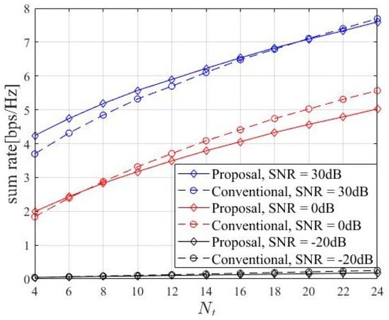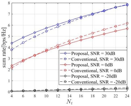 The sum rate of the conventional and proposed architecture per number of transmitting antennas without antenna selection for various SNR powers of −20 dB, 0 dB, 30 dB.