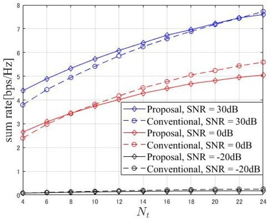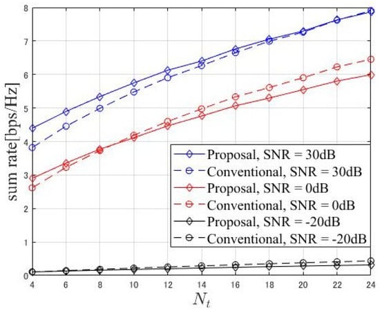 Figure 6 and Figure 7 show the sum-rate when the number of users is set to 4 and the number of transmit antennas is increased. Figure 6 shows the case without antenna selection, and Figure 7 shows the case with antenna selection. Figure 6 shows that the sum-rate of the proposed method has the same performance as the conventional method when is 8 with SNR of 0 dB, and when is 20 with SNR of 30 dB. Similarly, Figure 7 shows that the sum-rate of the proposed method has the same performance as the conventional method when is 8 with SNR of 0 dB, and when is 22 with SNR of 30 dB. This means that when the number of transmit antennas is small, the number of phase shifters can be reduced while maintaining better performance compared to the conventional method. However, as the number of transmit antennas increases, the grouping algorithm will not optimize the transmit antennas for users who are late in the order of determining the group of antennas, resulting in gradually inferior performance compared to the conventional method. Also, Figure 6 and Figure 7 show that the difference between the sum-rate performance with antenna selection and without antenna selection increases as the number of transmit antennas increases for both the conventional and proposed methods. This is because the distribution of the gain of each transmit antenna becomes more diverse when the number of transmit antennas increases, and therefore, the antenna with higher gain can be selected for each user.