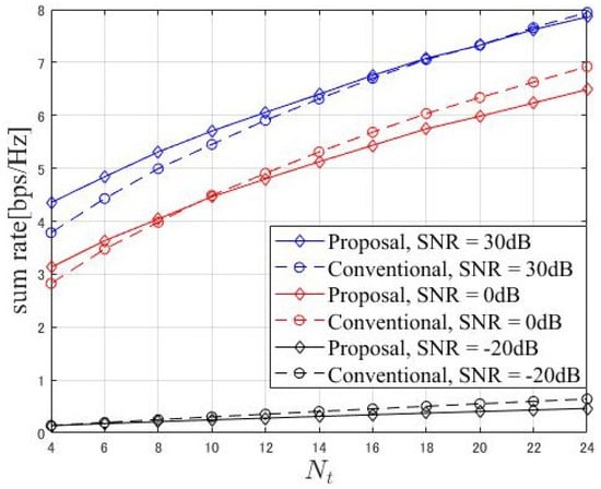 Figure 7 shows the sum-rate of the proposed method and the conventional method with antenna selection from antennas, whereas Figure 8, Figure 9 and Figure 10 show the sum-rate of the proposed method and the conventional method with antenna selection from 24, 100, and 1000 antennas. In Figure 6 and Figure 7, as the number of antennas increases, the sum-rate of the proposed method becomes inferior to that of the conventional method, and when the number of transmit antennas is 24 and SNR is 0 dB, the proposed method is the most inferior to the conventional method. On the other hand, in Figure 8, Figure 9 and Figure 10, when the number of transmit antennas is 24 and SNR is 0 dB, the proposed method is 9.72% lower than the conventional method when antenna selection is made from 24 antennas, 7.13% lower than the conventional method when antenna selection is made from 100 antennas, 6.26% lower than the conventional method when antenna selection is made from 1000 antennas. These results show that, in the case with antenna selection, the sum-rate of the proposed method can be maintained to some extent compared to the conventional method even when the number of transmit antennas increases as the number of antennas for antenna selection increases. In Figure 6 and Figure 7, as the number of transmit antennas increased, there was a problem, that is, transmit antennas were not optimized for users who were slow in selecting groups of antennas in order. On the other hand, in Figure 8, Figure 9 and Figure 10, as the number of antennas used for antenna selection increases, the distribution of the gain of each antenna becomes more diverse, and the average gain of all the transmit antennas used can be higher. Therefore, a user who selects a group of antennas in late order can select a group of antennas with higher gain, and the proposed method can maintain the performance of the conventional method even when the number of transmit antennas increases. These results suggest that the proposed method will be more effective when the number of antennas used for antenna selection is large.