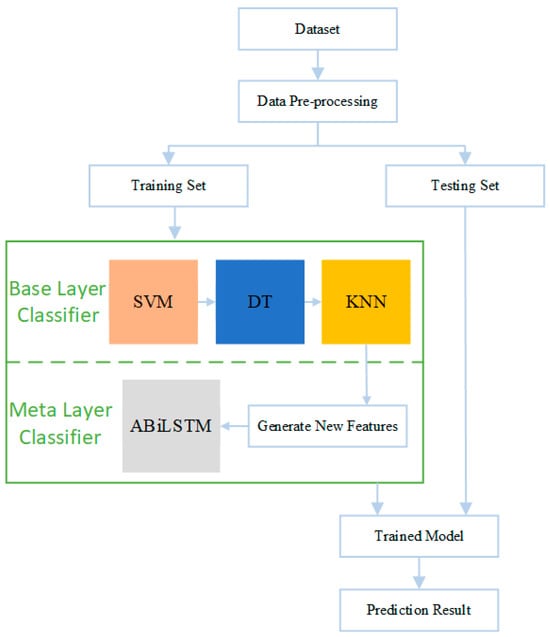 It can be seen that the stacking model using the DT, KNN, and SVM models as the base classifier and ABiLSTM as the meta layer classifier greatly improves the model performance compared with a single classifier.