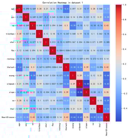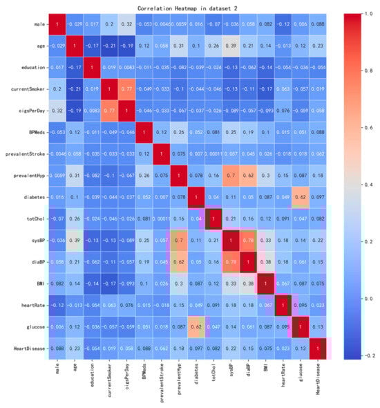 The heatmap function in the seaborn library is used to display the correlation between each feature. The correlation between the two characteristics is stronger for deeper grid colors; a positive correlation is shown by colors near red, and a negative correlation is indicated by colors near blue. Conversely, the lighter the grid color, the lower the correlation between the corresponding two features. The heat maps of the Cleveland and Framingham datasets are shown in Figure 3 and Figure 4.