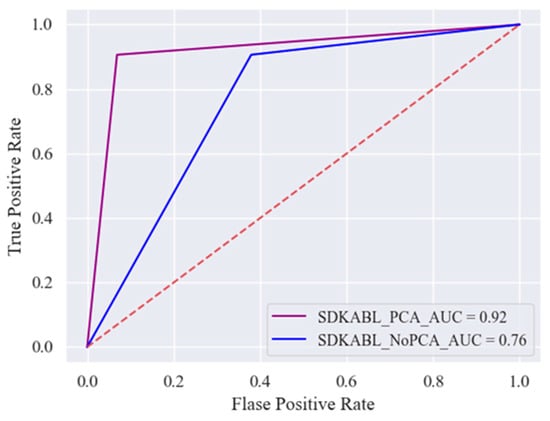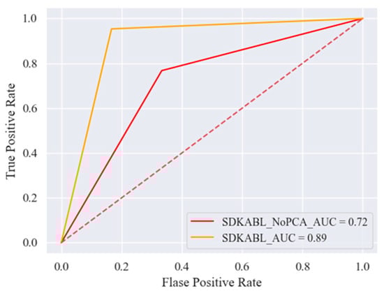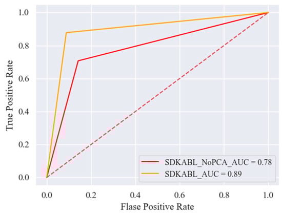 It can be seen that the PCA data show better performance under the same classifier. Although the values of these four indicators are not as good as those of dataset 1, they all reach more than 80%, with the recall rate improving the most, by 11.2%, compared to the data without PCA processing. Although the improvement in accuracy is the smallest, it is also an improvement of 7.1%. In dataset 2, PCA-treated data similarly reduced false positives in SDKABL model classification and greatly increased the number of TN samples. Finally, the AUC values of the two methods were obtained by the ROC curve. The AUC value of the PCA-treated model is 0.89, which is much higher than that of the non-PCA-treated model, and the AUC of the non-PCA-treated model is only 0.78.