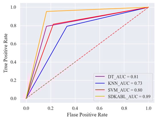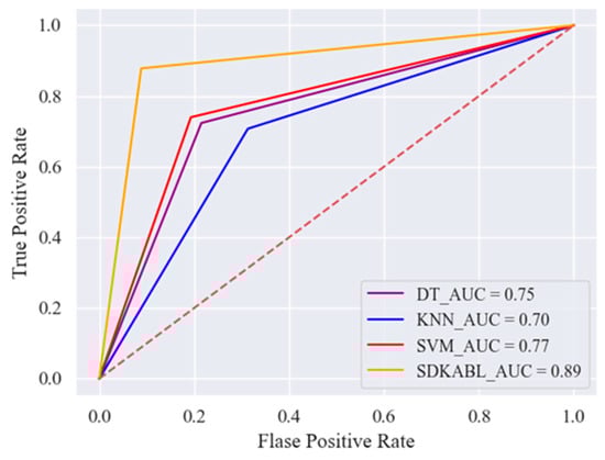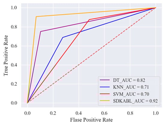 From Table 6, the performance of the SDKABL model is superior to the other three comparison models in all aspects, followed by the DT model, the AUC value of which is 0.82, and finally, the KNN and SVM models, the AUC values of which are almost 0.70. Among them, all indicators of the SDKABL model reach more than 90%, and its AUC value is 0.92, which is 0.1 higher than that of the DT model after its second performance and about 0.2 higher than that of the KNN and SVM models.
