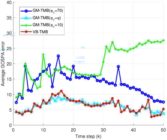 Under unknown time-varying noise parameters, the performance of the proposed TMB algorithm was evaluated and compared with the GM-TMB algorithm using different noise parameter settings. To implement the GM-TMB filtering algorithm with different initial noise parameters , the noise parameters were set to 10, initial value, and 70, respectively. Monte Carlo simulations were conducted for both algorithms over 100 runs, and the average GOSPA distances are shown in Figure 3. The reason why we use GOSPA for evaluation is that it is a metric for trajectories.