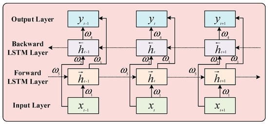 BiLSTM consists of two layers of LSTM with the same number of neurons; the forward layer and the backward layer are used to compute the sequential and reverse order information of the time series [], respectively, and, finally, the output of the forward layer and the output of the backward layer are linearly superimposed in accordance with a certain weighting and to obtain the final output , and the mathematical expression is shown in the following equation: