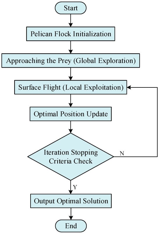 POA is the Pelican Optimization Algorithm, which achieves global exploration and local exploitation of the optimal solution by simulating the pelican flock’s approaching prey behavior and surface flight behavior, respectively, and achieves a proportional balance between exploration and exploitation to obtain the optimal solution. Figure 3 shows the optimization process of POA [].