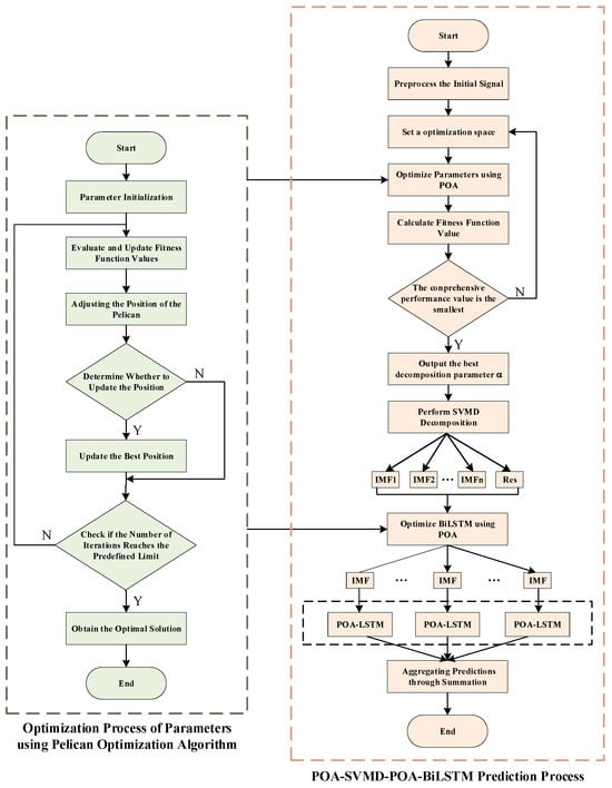 (2) This study employs the Pelican Optimization Algorithm (POA) combined with a Bidirectional Long Short-term Memory (BiLSTM) Network to optimize network parameters, while simultaneously optimizing the penalty factor in Successive Variational Mode Decomposition (SVMD), thereby enhancing the effectiveness and accuracy of data decomposition, improving learning efficiency, and fitting complex nonlinear relationships.