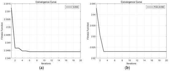 Fitness curve during decomposition: (a) fitness curve during optimization with SVMD; (b) fitness curve during optimization with POA-SVMD.