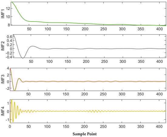 The decomposition results of the voltage degradation data by POA-SVMD are shown in Figure 7. The IGBT transient peak voltage degradation data can be observed to have been decomposed into four voltage components containing different features, among which component 1, component 3, component 2, and component 4 are extracted in order of frequency from low to high. After the above experimental optimization and validation of the results, it is finally concluded that = 1963 is the optimal solution.