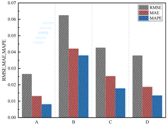 RMSE, MAE, and MAPE for different models. (A: POA-SVMD-POA-BiLSTM; B: POA-BiLSTM; C: POA-LMD-POA-BiLSTM; D: POA-EEMD-POA-BiLSTM).