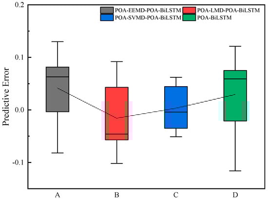Box diagram of forecasting error absolute values (A: POA-EEMD-POA-BiLSTM; B: POA-LMD-POA-BiLSTM; C: POA-SVMD-POA-BiLSTM; D: POA-BiLSTM).