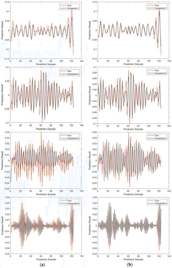 The life prediction results of each modal component: (a) predicted values of the components of the POA-SVMD-BiLSTM model; (b) predicted values of the components of the POA-SVMD-POA-BiLSTM model.