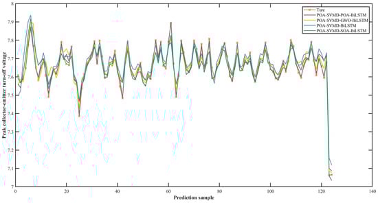 From Figure 10, the position by the SVMD optimized with POA displays a reduced deviation from the true values in comparison to the original SVMD. Furthermore, the prediction accuracy for the true values is heightened, leading to a more accurate prediction effect. Consequently, the utilization of POA to optimize the penalty factor of SVMD can be deemed necessary, and the incorporation of this optimization significantly enhances the prediction effect of the entire model.