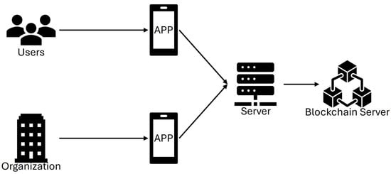 The system structure of a proposed scheme. Users are service provider receivers. Organizations are responsible for running and maintaining the social economy system. Users and organizations utilize APPs to operate the social economy system. The server is responsible for key generation and data storage and management. The proposed systems have private and public blockchain systems.