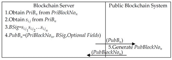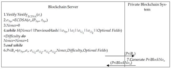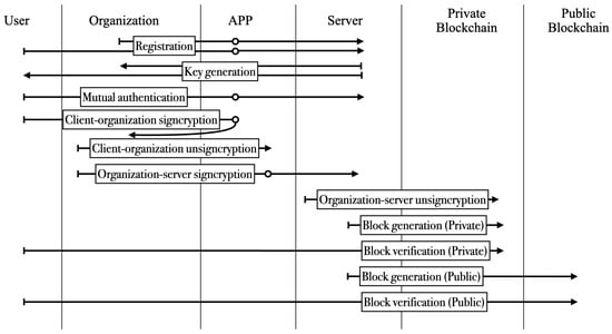 The proposed scheme includes twelve phases. Parameters for the whole system are generated preliminarily. Users and organizations must register to servers to become legitimate parties through the registration phase. Users are given a public and private key through the key generation phase, and users and organizations authenticate each other in the mutual authentication phase. When users want to transmit messages to organizations, the client–organization signcryption phase is executed, and organizations need to execute the client–organization unsigncryption phase to recover the message. Similar situations happen between organizations and servers in the organization–server signcryption and organization–server unsigncryption phases. After that, the server generates private and public blocks and sends them to private and public blockchain systems. The private blockchain system only allows legitimate members to join as a node and can be verified by users if conflicts happen. The proposed scheme also provides a public blockchain system for block verification using public nodes. Figure 3 illustrates a high-level overview of the proposed scheme.