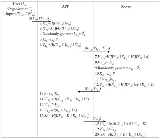 After user and organization input (, ) and are authenticated, the session key will be generated. The steps in detail are described as follows and are illustrated in Figure 6.