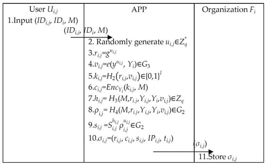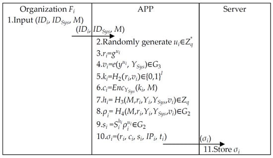 Step 5. The APP generates signature using (, ), outputs , and sends to organization .