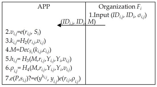 Step 3. The APP computes (, ) and verifies according to Equation (32). If it holds, the APP outputs M or False.