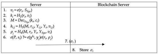 After completing the previous phase, organization signs and encrypts M and sends ciphertext to the server. The steps in detail are described as follows and are illustrated in Figure 9.