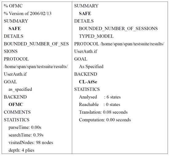 The AVISPA tool was utilized for analyzing large-scale internet security-sensitive protocols and applications [40,41]. The AVISPA tool executes simulation protocols specified in the HLPSL language [41]. To validate cryptographic protocols, the AVISPA tool includes four back-ends: the observational finite model checker (OFMC), the constraint logic-based attack searcher (CLAtSe), the SAT-based model checker (SATMC), and the tree automaton-based security protocol analysis with automatic approximation (TA4SP). We utilized the AVISPA tool and security protocol animator (SPAN) to provide security proofs for the proposed scheme. The proposed protocol was verified using the OFMC and CLAtSe back-ends within the AVISPA tool. We have two organizations: user (client/member) U and server S. To validate the proposed scheme, we considered three secrecy goals and two authentication goals, as follows.