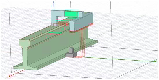 Table 1. The magnet, indicated in light green, acts as the magnetic excitation. The goal of the simulation was to explore the field’s behavior when the fastening is moving by under the detector, simulating a tamping machine going over sleepers. The simulation study was carried out as a sequence of single field simulations for scenarios from step-wise changes of the distance between the sensor and the fastening bolt, with steps of 10