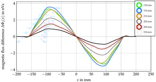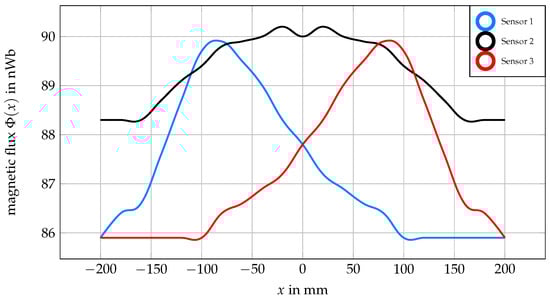 Figure 7 the magnetic flux at the three sensor positions are visualized while having the relative motion of the rail (thus the sleeper fastening) with respect to the sensor. For sensor 1 the highest magnetic flux is measured at