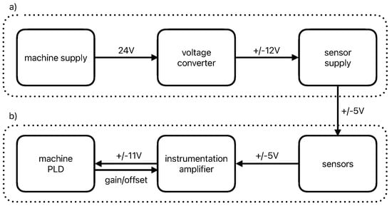The working principle is as follows: The voltage references control the voltage for the voltage followers to within tight limits which themselves supply the sensors with high precision operating supplies, which the references are not designed to provide directly. The sensors’s output signals are filtered with a first-order low-pass filter with a cut-off frequency of 1592 to allow for higher detection speeds and effectively suppress AC traction current’s interferences before the pedestal compensation is done by the instrumentation amplifier. Due to the amplification of only the difference of the signals, a near zero voltage level at zero deflection is striven for. Therefore, an offset correction circuit is implemented which takes an external voltage signal through a voltage divider and a voltage follower, before it is passed to the instrumentation amplifier. With this method, offset can be adapted for each detector individually improving detection probability due to higher possible gain. Additionally, the offset pin can be grounded with a jumper in case no offset correction signal is available. The output signal of the electronic circuit is an analog amplified voltage signal () to be processed by an external programmable logic device (PLD) with exactly that input voltage range. This PLD is responsible for the surveillance and processing of all sensor data of the tamping machine.