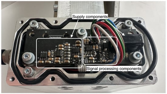 Figure 10 shows the printed circuit board already installed in the current detector prototype. Attention was paid in particular on a compact design to ensure short routes for minimal parasitic effects and best performance. The grey cables lead down to the sensor board and supply the sensors, as well as return the sensors’ output signals. The multicolored cables lead to the plug connection, seen on the left, which connects the board supply and the amplifier output to the supply cable. The board has a length of 90